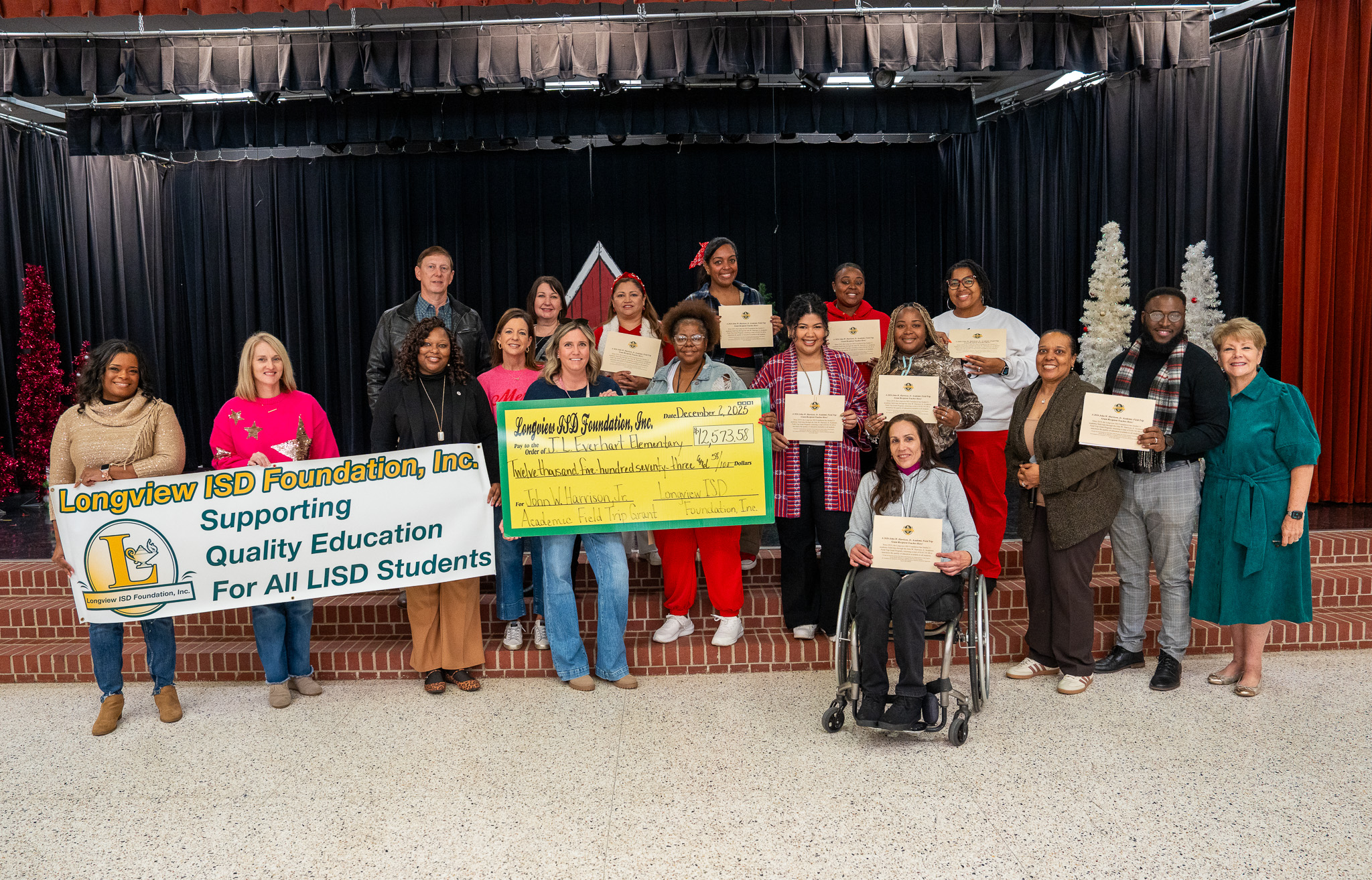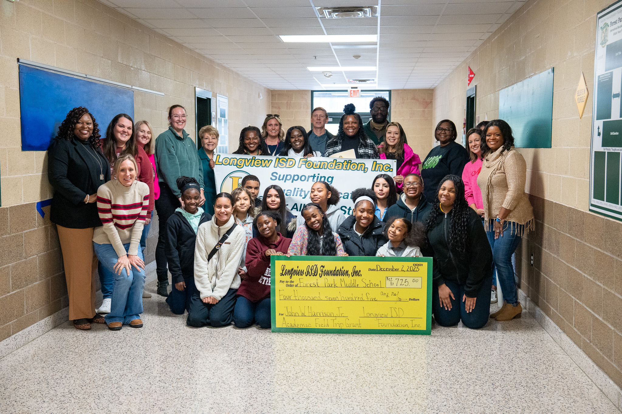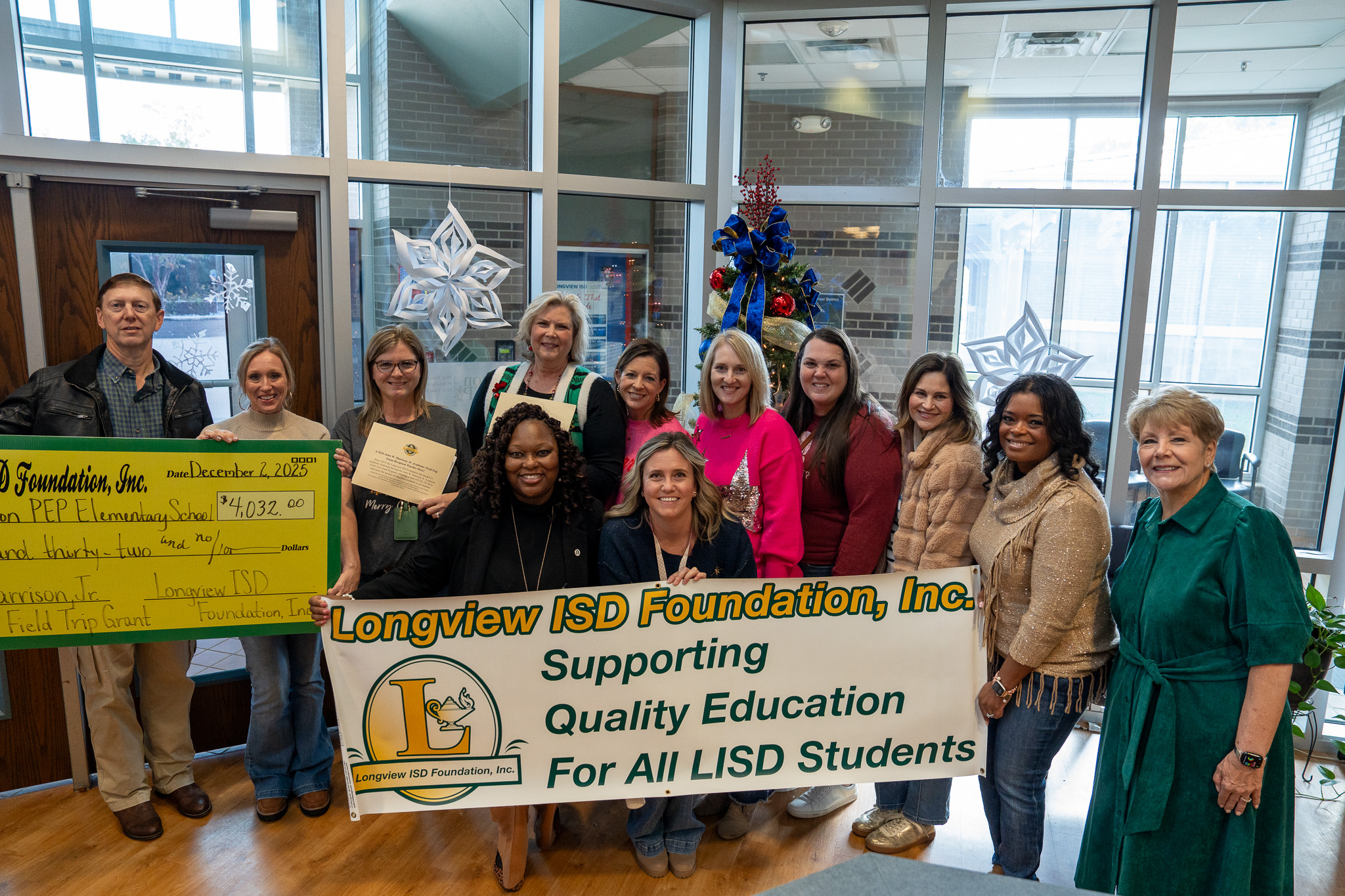 On December 2, 2025, the Longview ISD Foundation presented its annual John W. Harrison, Jr. Academic Field Trip Grants, named for the late Mr. Harrison, longtime Longview ISD school board member to honor his loyal support of the Foundation. Traveling to five Longview ISD campuses, Heather Hilton, chair of the academic field trip grant committee, Foundation board members, and Kay Ray, Foundation director, surprised the recipients and their students with the funding news.