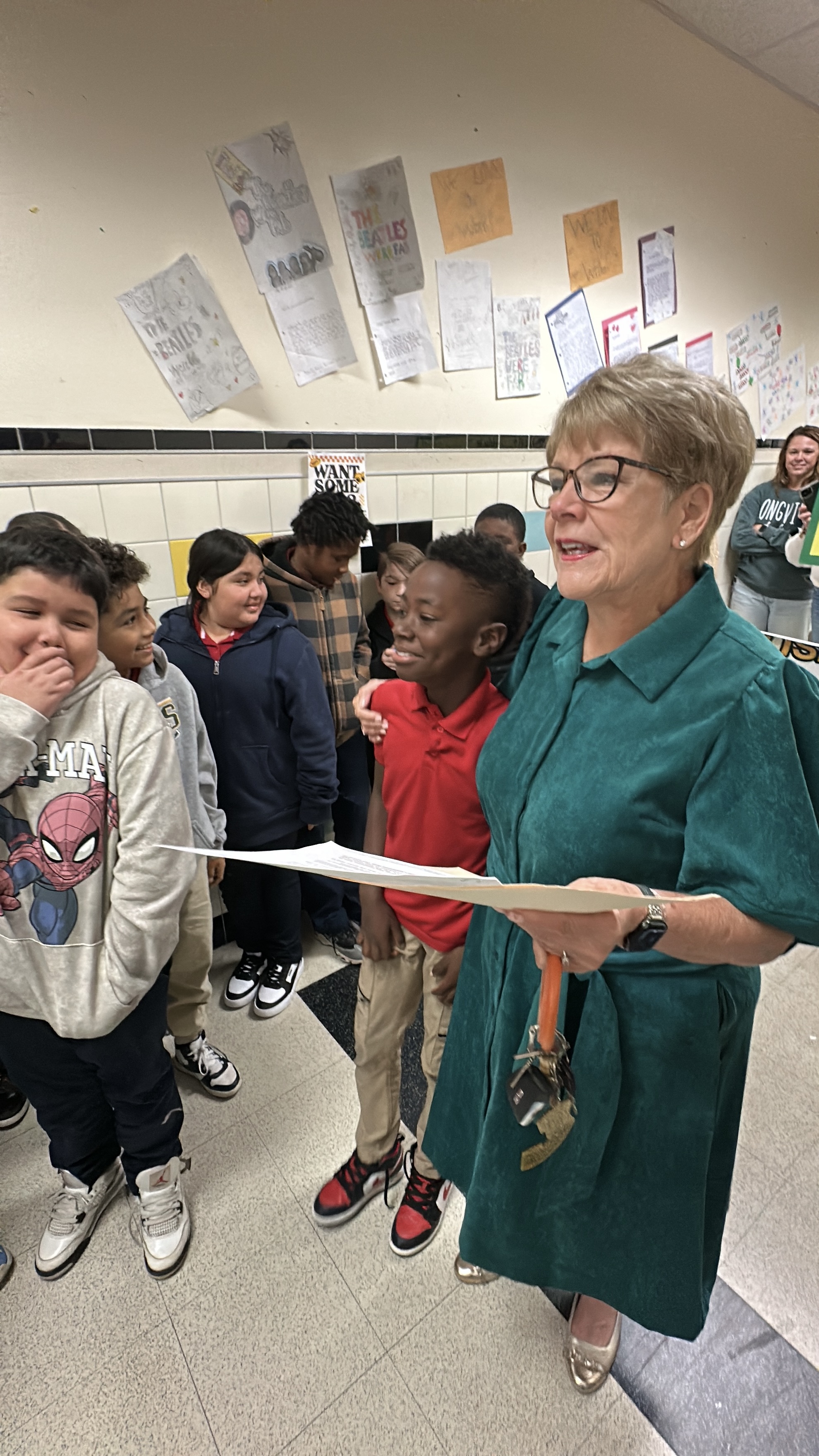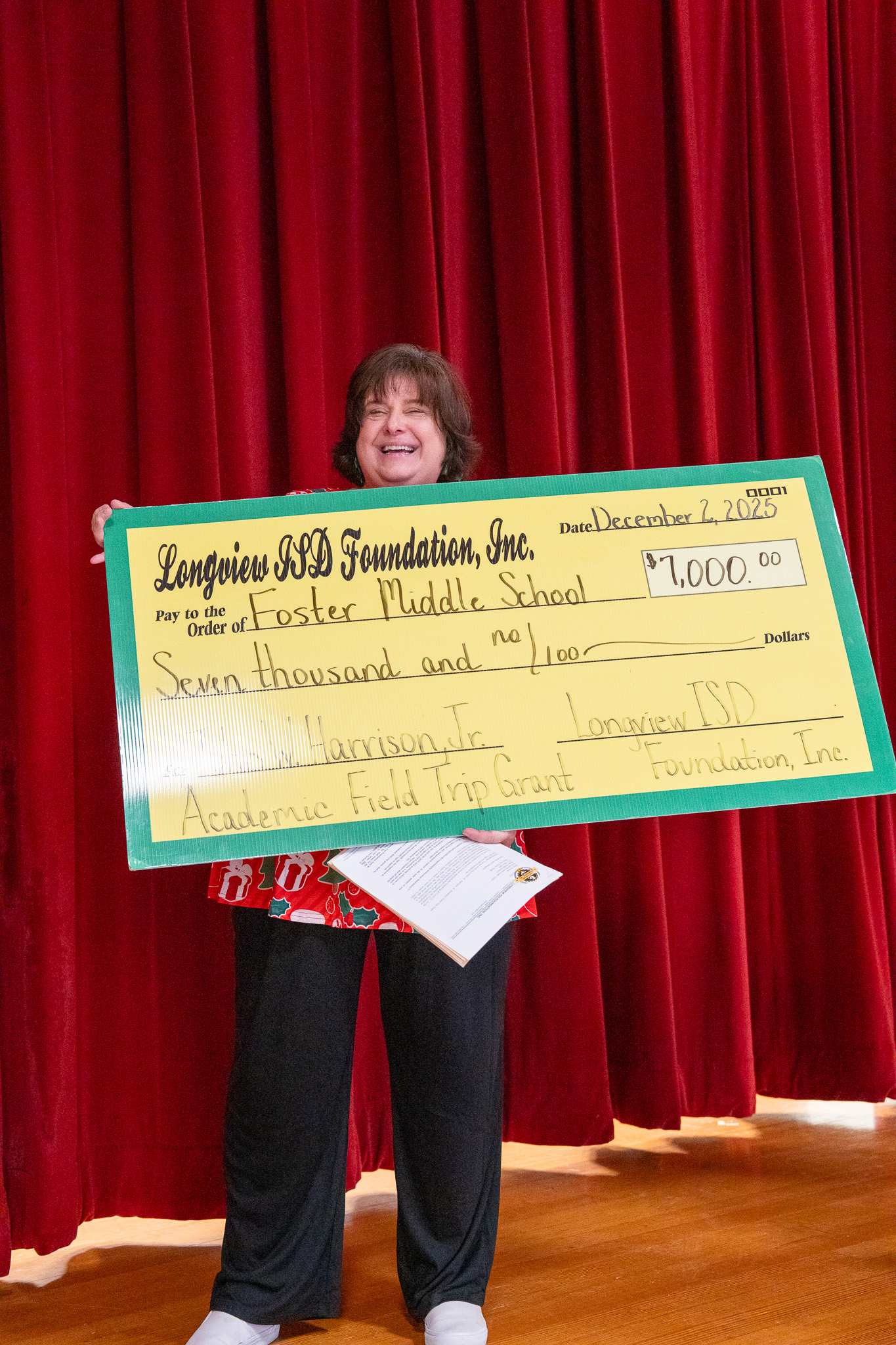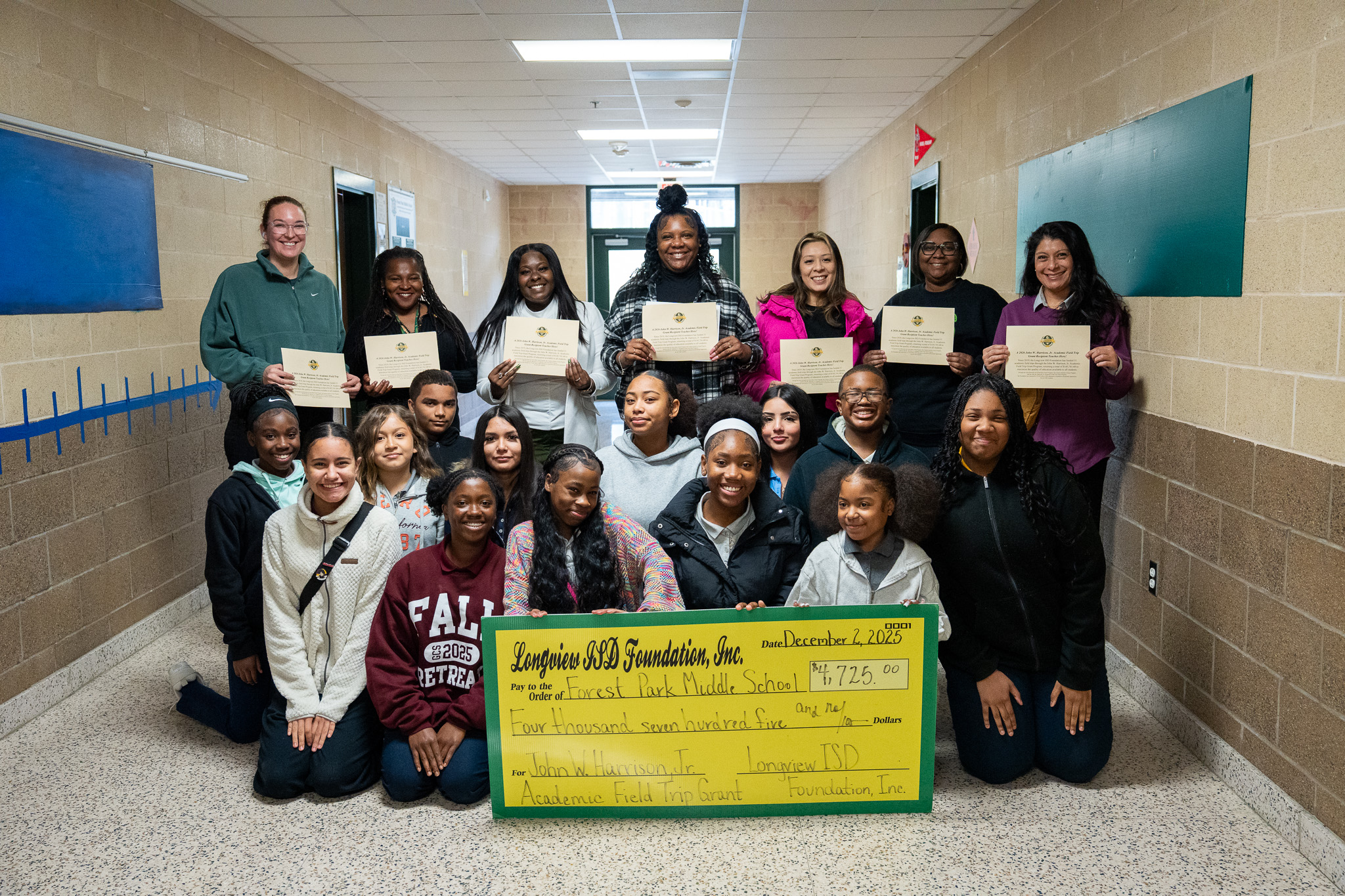 On December 2, 2025, the Longview ISD Foundation presented its annual John W. Harrison, Jr. Academic Field Trip Grants, named for the late Mr. Harrison, longtime Longview ISD school board member to honor his loyal support of the Foundation. Traveling to five Longview ISD campuses, Heather Hilton, chair of the academic field trip grant committee, Foundation board members, and Kay Ray, Foundation director, surprised the recipients and their students with the funding news.